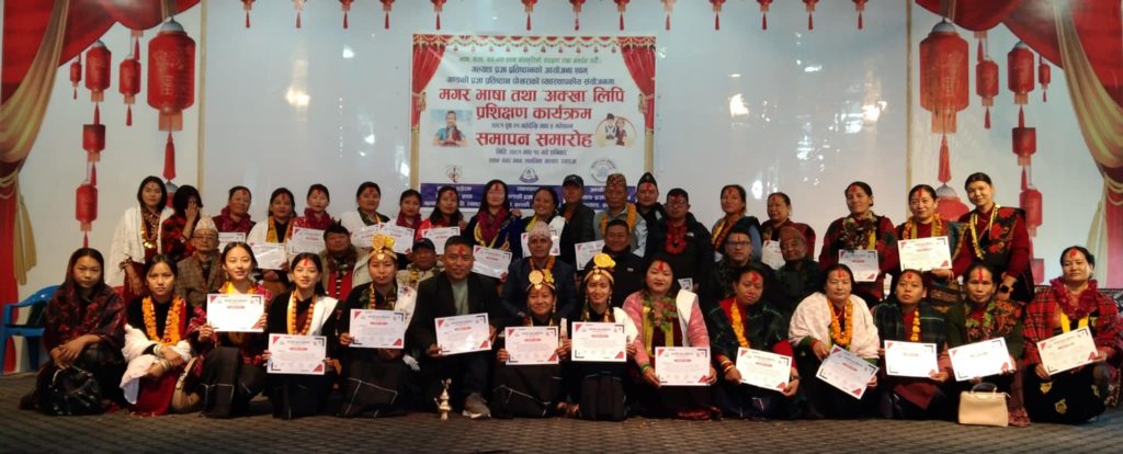 स्याङ्जा । मगर समुदायको भाषा र संस्कृति जोगाउन युवायुवतीलाई प्रशिक्षण गरिएको छ । ‘भाषा, कला, सङ्गीत एवम् संस्कृतिको संरक्षण तथा संवर्धन गरौं’ भन्ने मुल नारा सहित स्याङ्जाको गल्याङ्मा मगर भाषा ‘अक्खा लिपि’ प्रशिक्षण गरिएको हो । नेपाल मगर संघ गल्याङ् र गल्याङ् प्रज्ञा प्रतिष्ठानको आयोजनामा र गण्डकी प्रज्ञा प्रतिष्ठानको सहयोगमा मगर समुदायको लोपोन्मुख भाषाको संरक्षणका लागि पौष २१ गतेदेखी माघ १२ गतेसम्म संचालन गरिएको थियो ।