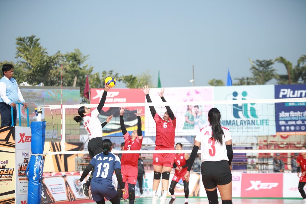 यस्तै, महिलातर्फ आयोजक टिमलाई पराजित गर्दै एपिएफले फाइनलमा आफ्नो स्थान सुरक्षित पारेको छ । साविक विजेता एपिएफले आयोजक टोलीलाई ३–१ ले पराजित गरेको हो । पहिलो सेट २५–२० ले आफ्नो पक्षमा पारेको एपिएफले दोस्रो सेट २१–२५ ले टाइगर ग्रुपलाई सुम्पिएको थियो । तेस्रो सेट २५–१९ र चौथो २६–२४ ले जित निकाल्दै एपिएफले फाइलन यात्रा तय गरेको हो । टाइगर अफ द म्याच निरुता ठगुन्ना र स्पाइकर अफ द म्याच सरस्वती चौधरी बनिन् ।