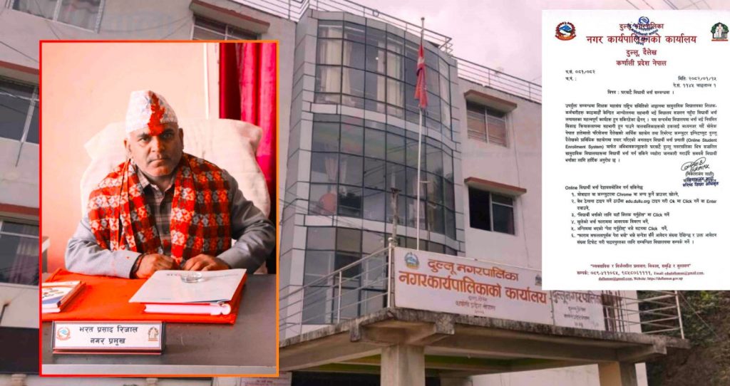 दैलेख । दैलेखको दुल्लु नगरपालिकाका नगरप्रमुख भरतप्रसाद रिजालले मंगलबार देखि विद्यालयहरूमा विद्यार्थी भर्ना प्रक्रिया सुरु गर्न निर्देशन दिनुभएको छ ।