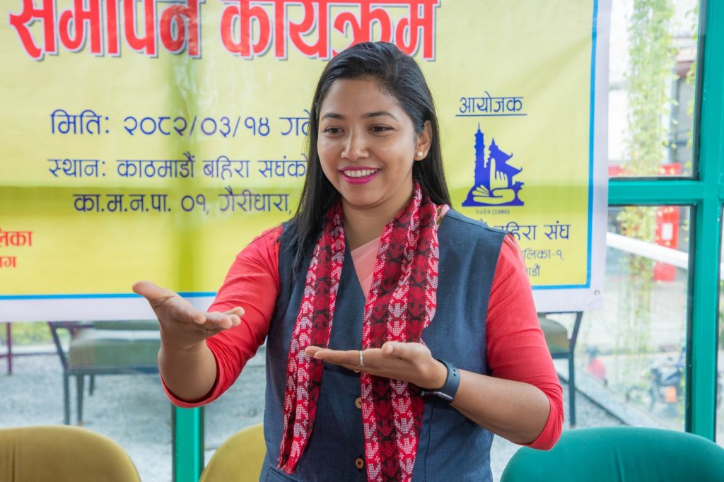 समापन कार्यक्रममा संघका अध्यक्ष सत्यदेवी वाग्लेले, नेपाली सांकेतिक शव्द सीमित भएको बताउँदै सार्वजनिक सेवामा जाँदा नयाँ नयाँ शव्द आउने र ती शव्दको संकेत नभएकोले ठाउँठाउँमा समस्या पर्ने अनुभव सुनाए । यसको समाधानका लागि महानगरपालिकाले नियमित प्रशिक्षण सञ्चालन गरिदिनुपर्ने उहाँको माग थियो ।