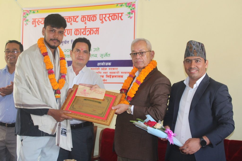 सुर्खेत । सुर्खेतका उत्कृष्ट तीन कृषकलाई मुख्यमन्त्री उत्कृष्ट कृषक पुरस्कार प्रदान गरिएको छ । कृषि विकास निर्देशनालय सुर्खेतले भेरीगंगा नगरपालिका ८ का विनोद शर्मा, वीरेन्द्रनगर नगरपालिका–१३ ललितप्रसाद लामिछाने र भेरीगंगा नगरपालिका १० मा अञ्जना बुढालाई नगदसहित पुरस्कार प्रदान गरेको हो ।