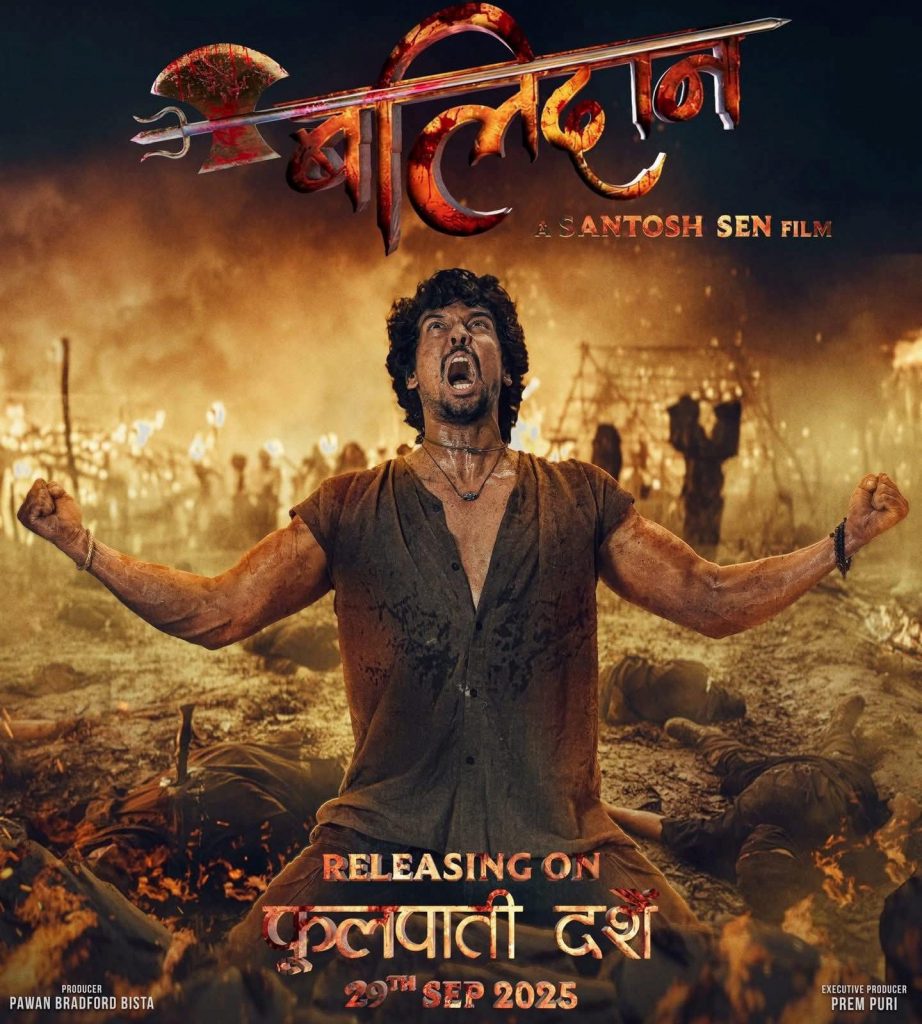 यस्तै फूलपातीमा रिलिज हुने अर्को नेपाली चलचित्र ‘बलिदान’लाई सन्तोष सेन ठकुरीले निर्माण तथा निर्देशन गरेका हुन् । यो एक्सन प्रधान चलचित्र हो । बाँकी दुई चलचित्र जस्तै यो चलचित्र पनि दसैँमा बाजी मार्ने पक्षमा रहेको छ । यो चलचित्रको फस्ट लुक्स पोस्टरमा अभिनेता समीर भट्टलाई विशेष स्थान दिइएको छ । अघिल्लो दसैँमा रिलिज भएको चलचित्र १२ गाउँको सफलता पछि समीरको यो दोस्रो चलचित्रमा पनि दसैँमा रिलिज हुन लागेको हो ।