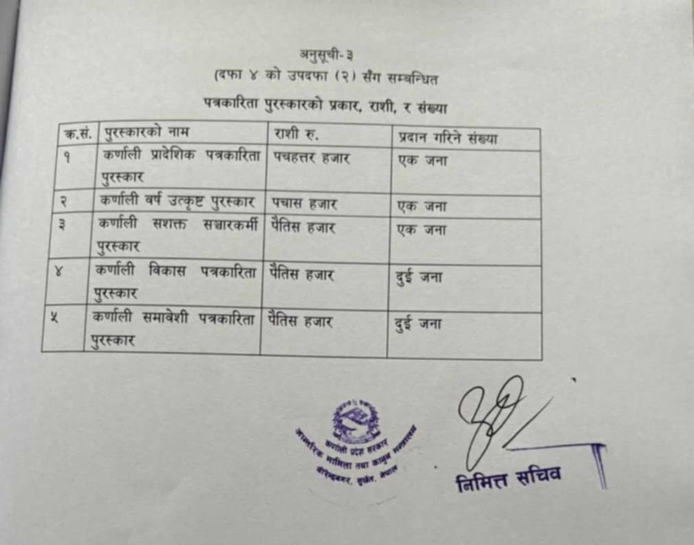 सुर्खेत । कर्णाली प्रदेशको बुधबार बिहान बसेको मन्त्रिपरिषद् बैठकले पत्रकारिता पुरस्कार वितरण कार्यविधि २०८२ लाई स्वीकृत गरेको छ । यस अघिको कार्यविधिलाई खारेज गर्दै मन्त्रिपरिषद् बैठकले नयाँ कार्यविधि स्वीकृत गरेको हो ।