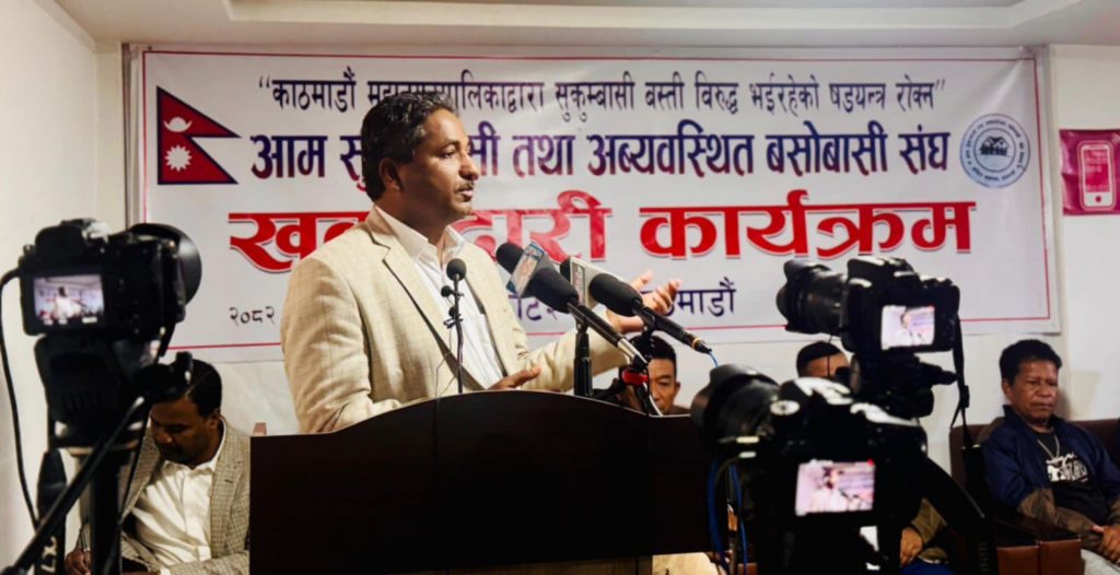 ‘सुकुम्बासीलाई हटाउने होईन, बसिरहेकै क्षेत्रमा पक्की घर बनाएर सरकारले दिनुपर्छ । संविधान, कानूनले सबै नेपालीको बस्ने, खाने, रोजगारी गर्ने अधिकार दिएको छ । यदी कानून विपरित काठमाडौं महानगरले सुकुम्बासी बस्तीमा डोजर आतंक मचाएर उपद्रो मचाउन खोजे त्यो आफूहरुलाई कुनै हालतमा स्वीकार्य हुदैन,’ आजपा अध्यक्ष साहले भने, ‘गरिब हटाउने होइन, गरिबी हटाउने सदबुद्धी मेयर बालेनलाई आओस । सुकुम्बासीलाई आतंकित बनाउने कार्य बन्द गर्नुस् । त्यो हामीलाई कुनै हालतमा पनि स्वीकार्य छैन् ।’