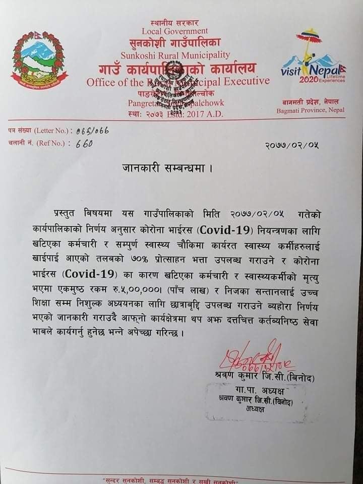 सिन्धुपाल्चोक । लक डाउनको समयमा स्थानीयको स्वास्थ्य उपचारमा खटिने सुनकोशी गाउँपालिकाका सबै स्वाथ्यकर्मीहरुलाई अहिले खाइपाइ आएको तलबमा ७० प्रतिशत थप सुविधा उपलब्ध गराउने गाउँपालिकाले निर्णय गरेको छ ।
