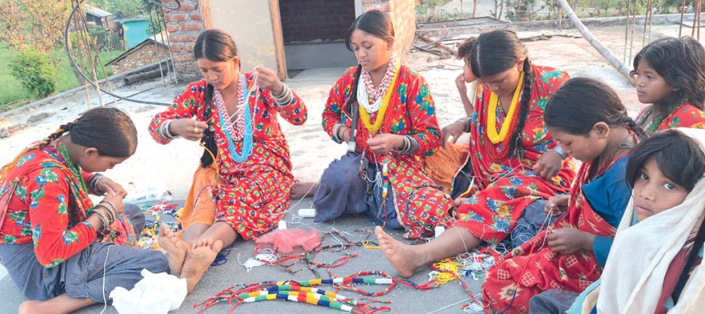 राउटे युवती गाजली शाही भन्छिन्, ‘पहिले हामीलाई एकै किसिमको पोते मात्र बनाउन आउँथ्यो, तालिम पाएपछि बस्तीमै बसेर विभिन्न डिजाइनका पोते, झुम्का र चुरासेट बनाउन थालेका छौं ।’