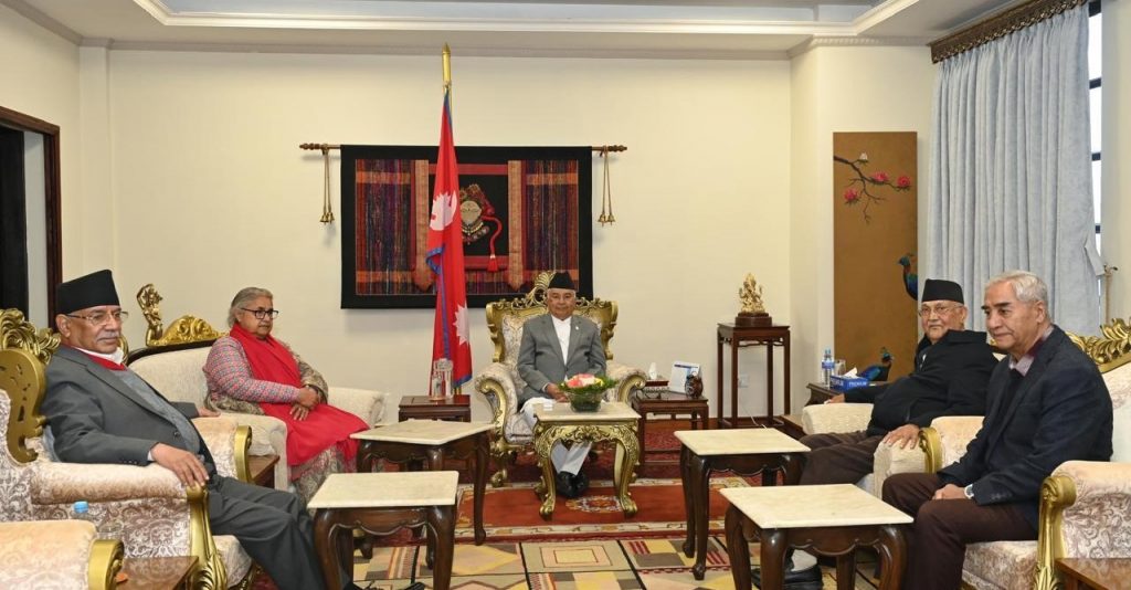राष्ट्रपति भवन शीतल निवासमा मङ्गलबार अपराह्न प्रधानमन्त्री सुुशीला कार्कीसहित नेपाली कांग्रेसका सभापति एवम् पूर्व प्रधानमन्त्री शेरबहादुर देउवा, नेकपा (एमाले)का अध्यक्ष एवम् पूर्व प्रधानमन्त्री केपी शर्मा ओली र नेपाली कम्युनिष्ट पार्टी (नेकपा)का संयोजक एवम् पूर्व प्रधानमन्त्री पुष्पकमल दाहाल‘प्रचण्ड’सँगको छलफलमा यस्तो समझदारी जुटेको हो ।