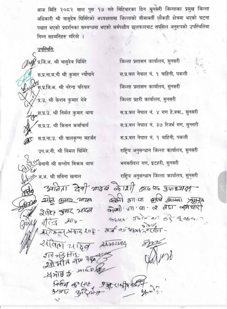 विराटनगर । सुनसरीको कोशी गाउँपालिकामा सशस्त्र प्रहरीको गोली लागेर भएको मृत्यु पश्चात् उत्पन्न तनाव मत्थर पार्न प्रशासन र स्थानीय प्रतिनिधिबीच ५ बुँदे सहमति भएको छ। बिहीबार प्रमुख जिल्ला अधिकारी बासुदेव घिमिरेको अध्यक्षतामा बसेको सर्वपक्षीय छलफलले छानबिन समिति गठन गर्नेदेखि मृतकका परिवारलाई राहत र रोजगारी उपलब्ध गराउनेसम्मका निर्णय गरेको छ।