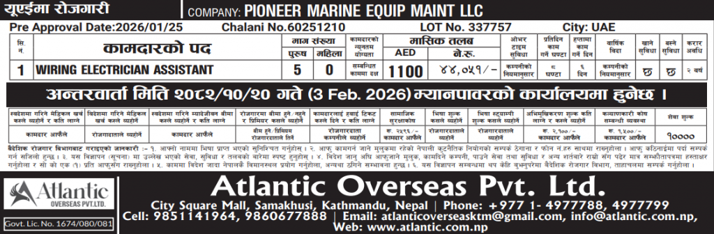 Male : WIRING ELECTRICIAN ASSISTANT in UAE , 5 no