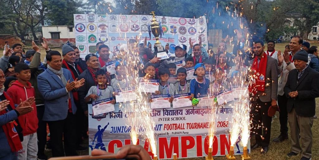 वीरगन्ज । राष्ट्रिय तथा अन्तराष्ट्रियस्तरका खेलाडी उत्पादन गर्ने लक्ष्य सहित एकदशक अगाडीबाट सुरु भएको प्याव्सन पर्सा जुनियर फुटवल प्रतियोगिता २०८२ सम्पन्न भएको छ । एकहप्तादेखि वीरगन्जमा जारी प्रतियोगितामा कुल २१ विद्यालयका २१ वटा टीमका बीच प्रतिस्पर्धा भएको हो ।