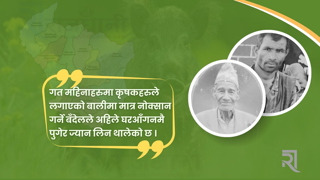 ‘नियन्त्रणका लागि हामीसँग पर्याप्त साधन छैनन्, कानुनले पनि बँदेल मार्न अनुमति दिँदैन,’ उनी भन्छन्, ‘यहाँका किसानहरू बँदेल र बाँदरको समस्याबाट अत्यन्तै पीडित छन् । वर्षभरि मेहनत गरेर लगाएको बालीसमेत सुरक्षित रूपमा घर भित्र्याउन मुस्किल भएको छ ।’