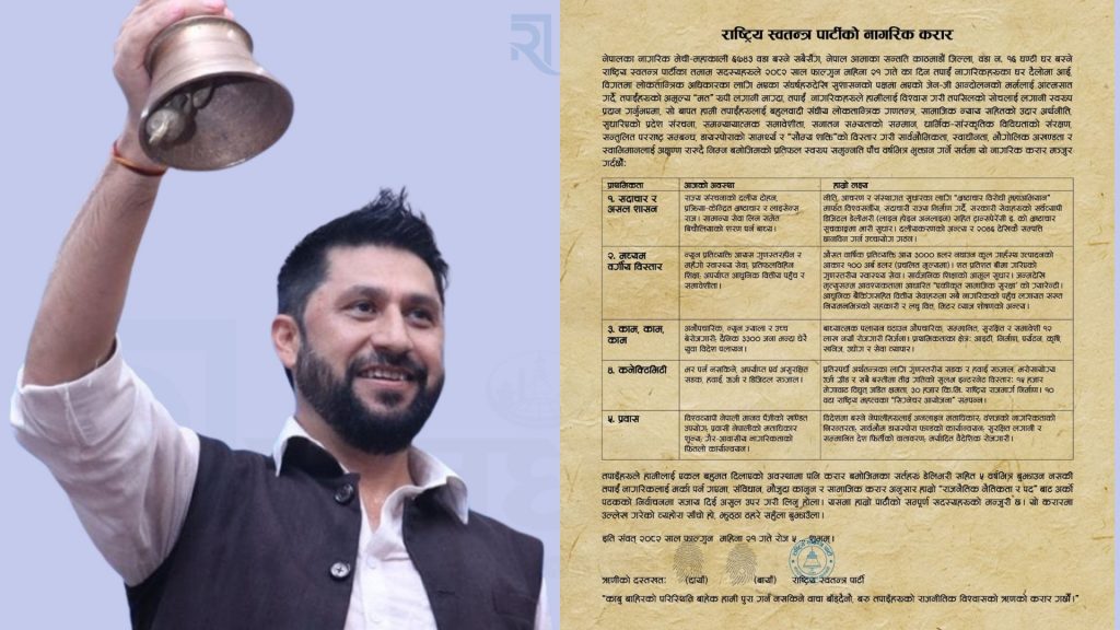 करार पत्रको प्रतिलिपि फेसबुकमा हाल्दै सभापति लामिछानेले लेखेका छन्, ‘चुनावमा बाचा त धेरैले धेरै पटक गरे । तर, पूरा नगरेको परिणाम उनीहरूले होइन, जनताले नै भोग्नुपर्यो निरन्तर । हामी पूरा नहुने वाचा होइन, जनतासँग प्रतिज्ञाको करार गर्दैछौं ।’