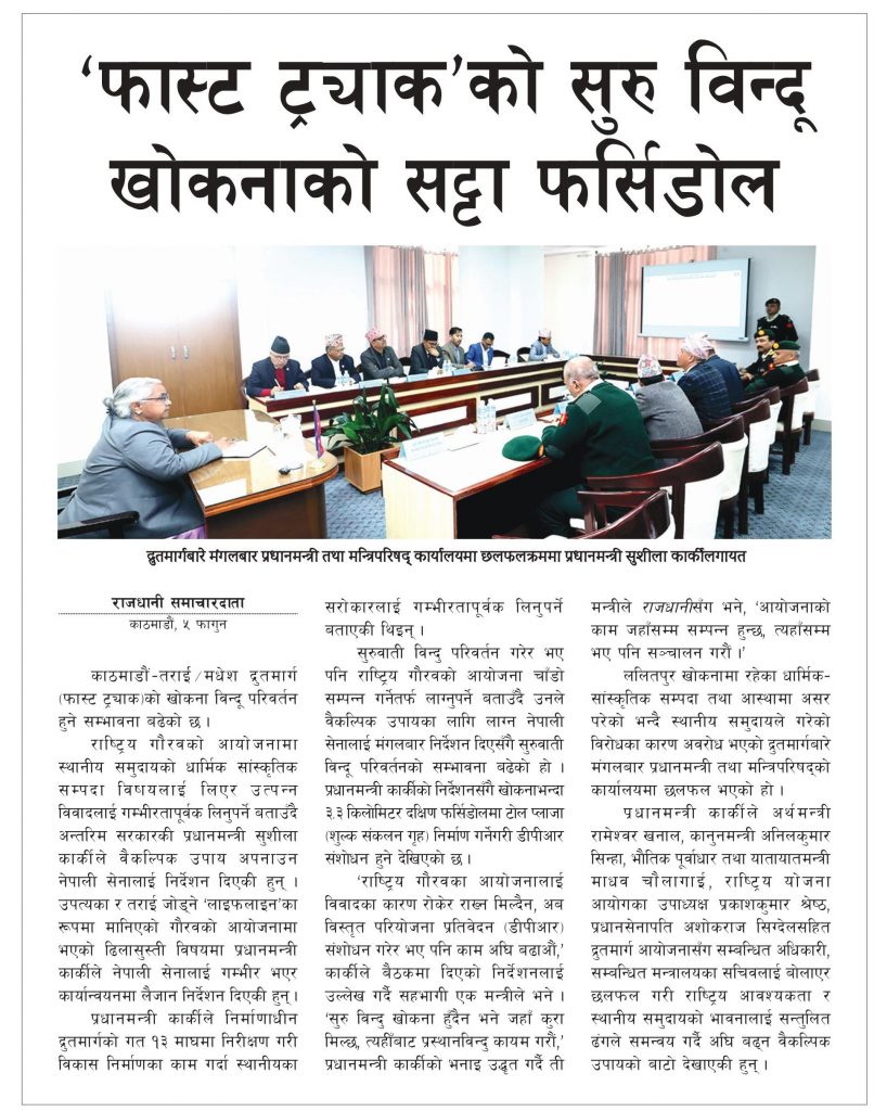 राष्ट्रिय गौरवको आयोजना चाँडो सम्पन्न गर्न प्रधानमन्त्रीको निर्देशन