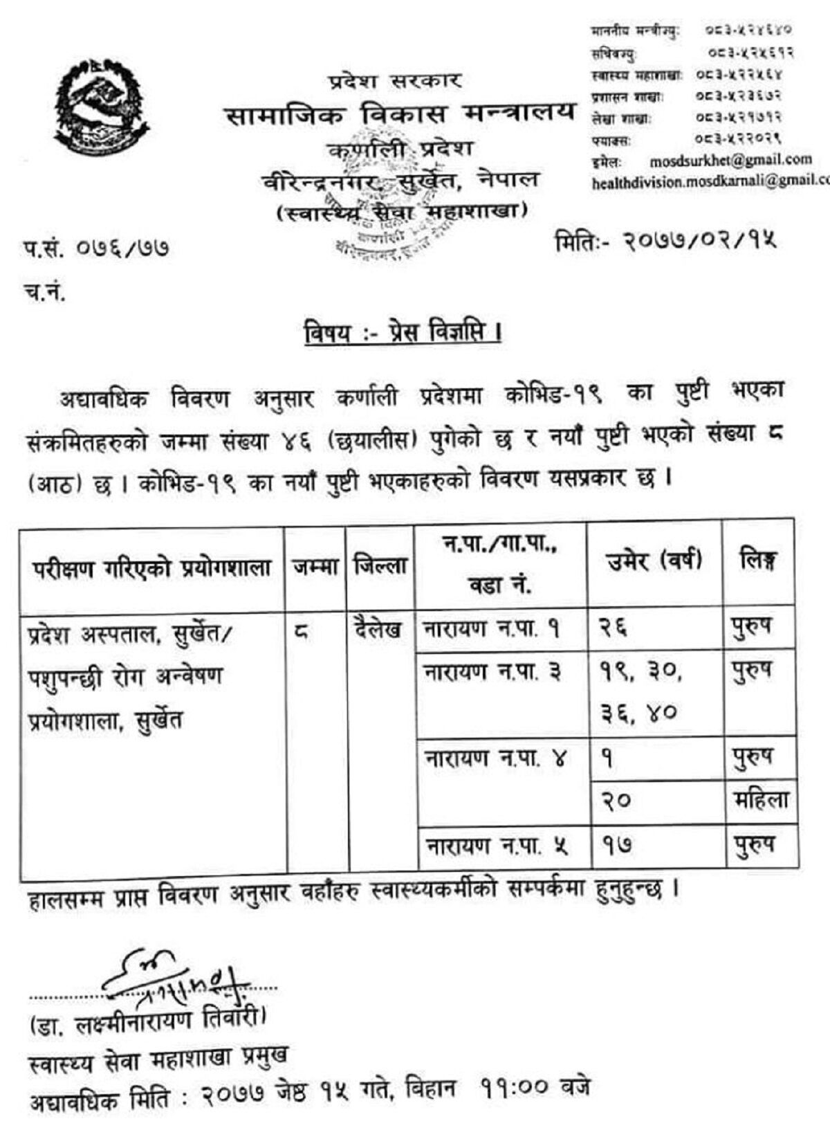 वीरेन्द्रनगर । कर्णाली प्रदेशमा बिहिबार ८ जनामा कोरोना भाइरस संक्रमण पुष्टि भएको छ । प्रदेश अस्पताल सुर्खेतमा रहेको पशुपन्छी रोग अन्वेषण प्रयोगशालामा गरिएको पिसिआर परीक्षणमा दैलेख नारायण नगरपालिका–१ का २६ वर्षीय पुरुष, वडा नम्बर ३ का १९ वर्षीय किशोर र ३०, ३६, ४० वर्षीय पुरुष रहेका छन् ।