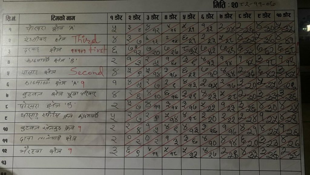 कडा प्रतिस्पर्धाका बीच ६८ अंक प्राप्त गर्दै थकाली युवा परिवार दरबाङ क्षेत्र प्रतियोगिताको प्रथम स्थान हासिल गर्न सफल भएको छ। त्यसैगरी, ४५ अंकसहित थकाली युवा परिवार थासाङ क्षेत्र दोस्रो र ४१ अंकसहित थकाली युवा परिवार स्याउलीवाङ क्षेत्र तेस्रो स्थानमा रहे। विजयी टोलीहरूलाई नगद पुरस्कार, ट्रफी र प्रमाणपत्र प्रदान गरिएको छ।