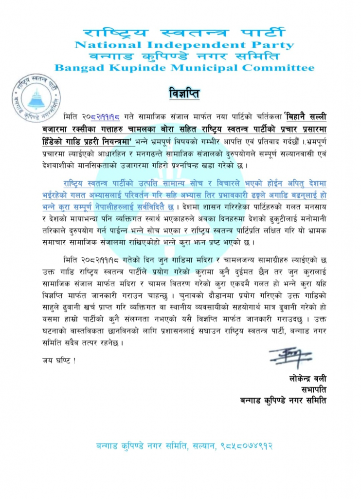 बन्गाड कुपिण्डे नगर समितिका सभापति लोकेन्द्र वलीले विज्ञप्ति जारी गर्दै सामाजिक सञ्जालमा रास्वपाको प्रचारमा हिँडेको गाडीबाट रक्सी र चामलका बोरा बरामद भएको भन्दै गरिएको प्रचार भ्रमपूर्ण रहेको जनाएका हुन्।