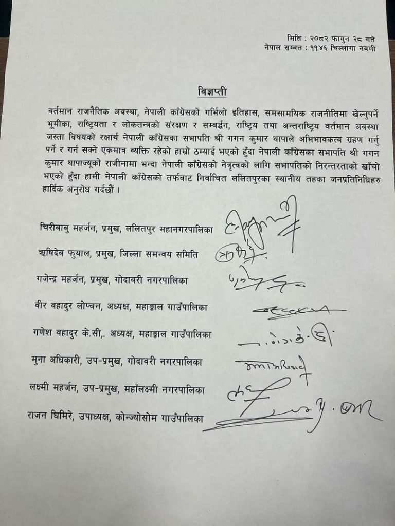 गगन थापालाई कांग्रेस सभापति पदबाट राजीनामा नदिन ललितपुरका जनप्रतिनिधिहरूको आग्रह