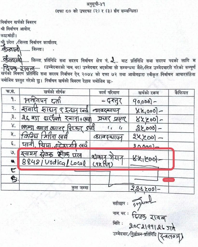 ‘क्यामेरा’ चुनाव चिह्न लिएर स्वतन्त्र उम्मेदवार बनेका दिपक रावलले जिल्ला निर्वाचन कार्यालय कैलालीमा पेश गरेको अनुसूची–४१ बमोजिमको खर्च विवरणमा ‘८८४८ भोड्का र लोकल रक्सी’ पिएको हिसाबसहितको खर्च विवरण बुझाएका हुन् । रावलले आफ्नै हस्तलिपिमा बुझाएको विवरणको सि. नं. ७ मा खर्चको शीर्षक ‘स्वयम सेवक र ८८४८–भोड्का–लोकल रक्सी’ राखिएको छ ।