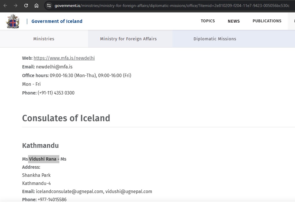 काठमाडौं । राष्ट्रिय स्वतन्त्र पार्टीबाट निर्वाचित सांसद विदुषी राणा युरोपेली देश आयसल्याण्डले नियुक्त गरेकी अवैतनिक महावाणिज्यदूत रहेको पाइएको छ । कूटनीतिक जिम्मेवारीमा रहेकी राणा सांसद बन्न नैतिक दृष्टिले गलत भएको नेपाल सरकारका उच्च अधिकारी तथा कूटनीतिक मामिलाका जानकारहरू बताउँछन् ।