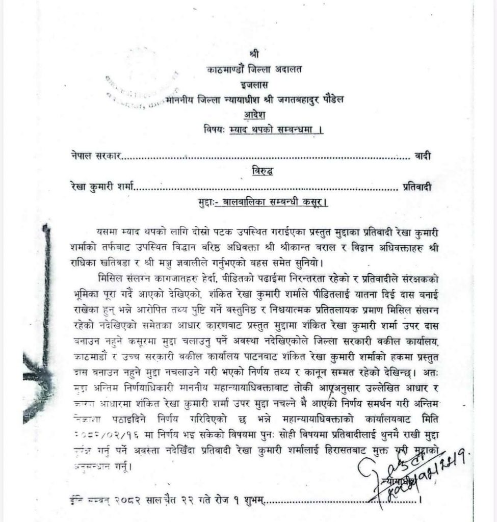 काठमाडौं । लुम्बिनी प्रदेश सभाकी सांसद रेखा शर्मा रिहा भएकी छन्। आइतबार जिल्ला अदालत, काठमाडौंका न्यायाधीश जगत पौडेलको इजलासले सांसद शर्मालाई हिरासतमा राखिरहन नपर्ने आदेश दिएको हो।