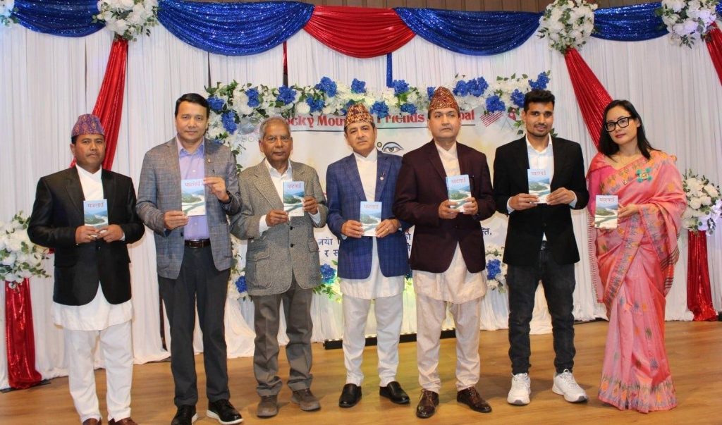 शनिबार कोलोराडोस्थित नेपाली घरमा नयाँ वर्ष विशेष कार्यक्रममा रक्की माउन्टेन संस्थाका पूर्वअध्यक्ष तथा प्रमुख अतिथी विनोद त्रिपाठी, विशेष अतिथीहरु प्रा.डा. विजय शर्मा, अन्तर्राष्ट्रिय नेपाली साहित्य समाज बोर्ड अफ ट्रष्टी सभापति तथा साहित्यकार पदम विश्वकर्मा, रक्की माउन्टेनका पूर्वअध्यक्ष टीका पौडेल, निवर्तमान अध्यक्ष अर्जुन बगाले, अध्यक्ष आकृति राई र लेखक विष्णु विवेकले ‘घाटगाउँ’ पूस्तकको विमोचन गरे ।