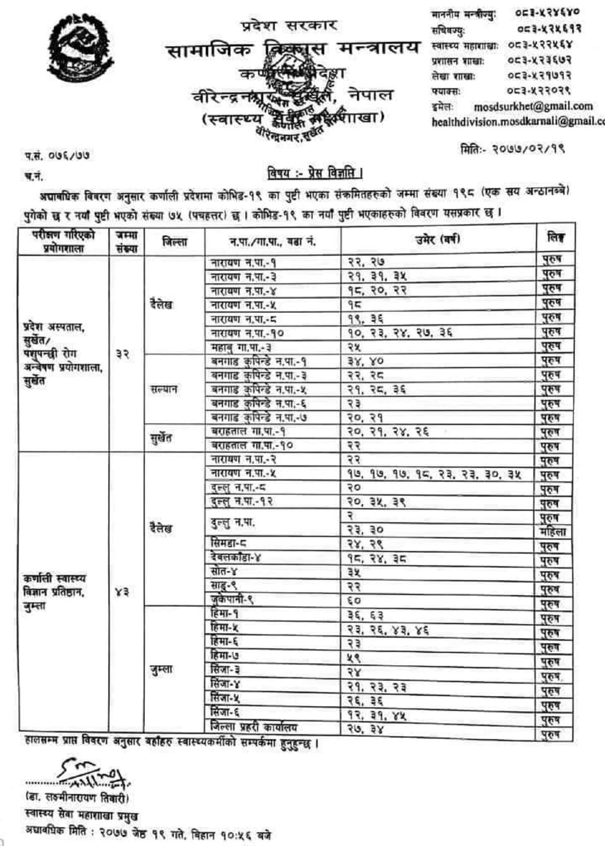 वीरेन्द्रनगर । कर्णालीमा थप नयाँ ७५ जना कोरोना संक्रमित भेटिएका छन् । पुरानो र नयाँ गरेर कर्णालीमा कोरोना संक्रमितको संख्या बढेर १९८ पुगेको छ । सामाजिक विकास मन्त्रलायको स्वास्थय सेवा महाशाखाले एक प्रेस विज्ञप्ती जारी गरी १९८ जना कोरोना संक्रमण भएको पुष्टि गरेको हो ।