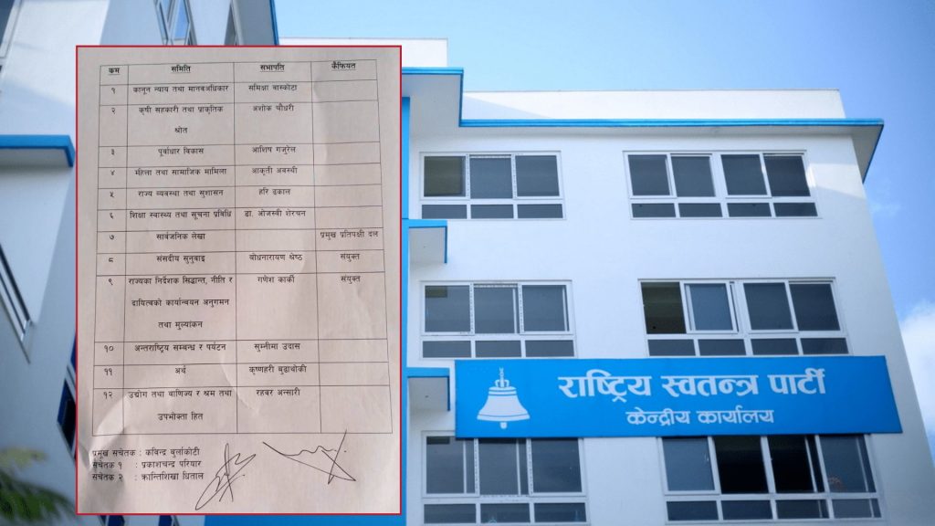 रास्वपाले कानून, न्याय तथा मानवअधिकार समितिको सभापतिमा समीक्षा बाँस्कोटा, कृषि, सहकारी तथा प्राकृतिक स्रोत समितिको सभापतिमा अशोककुमार चौधरी, पूर्वाधार विकास समितिको सभापतिमा आशिष गजुरेल र महिला तथा सामाजिक मामिला समितिको सभापतिमा आकृति अवस्थीलाई उम्मेदवार बनाउने निर्णय गरेको रास्वपा प्रमुख सचेतक कविन्द्र बुर्लाकोटीले जानकारी दिए ।