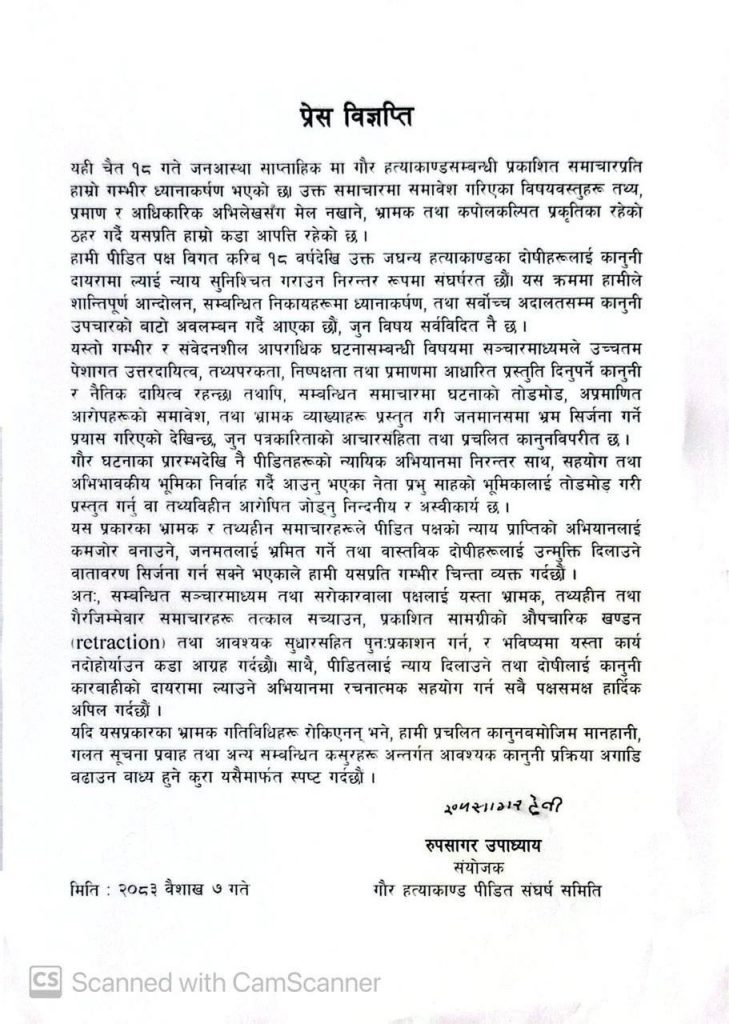 हालै जनआस्था साप्ताहिकमा गौर हत्याकाण्डसम्बन्धी प्रकाशित समाचारप्रति गम्भीर ध्यानाकर्षण भएको जनाउदै उनले उक्त समाचारमा समावेश गरिएका विषयवस्तुहरू तथ्य, प्रमाण र आधिकारिक अभिलेखसँग मेल नखाने, भ्रामक तथा कपोलकल्पित प्रकृतिका रहेको भन्दै कडा आपत्ति जनाएकी छन् ।