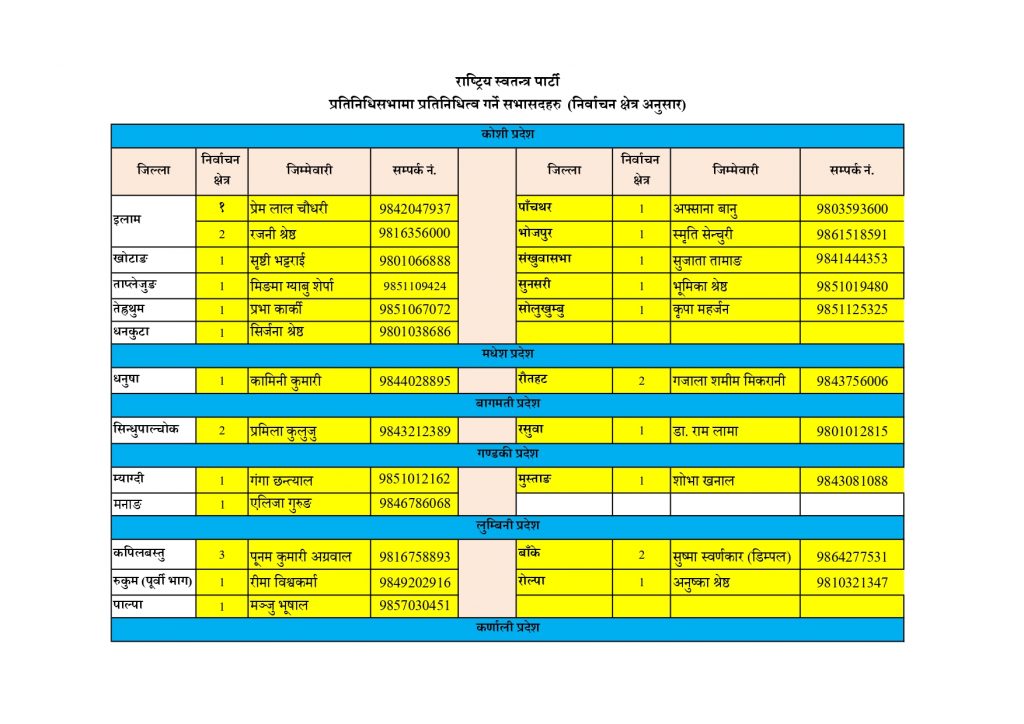 काठमाडौं । राष्ट्रिय स्वतन्त्र पार्टी (रास्वपा)ले निर्वाचन हारेको क्षेत्रको समानुपातिक सांसदलाई दिएको छ ।
