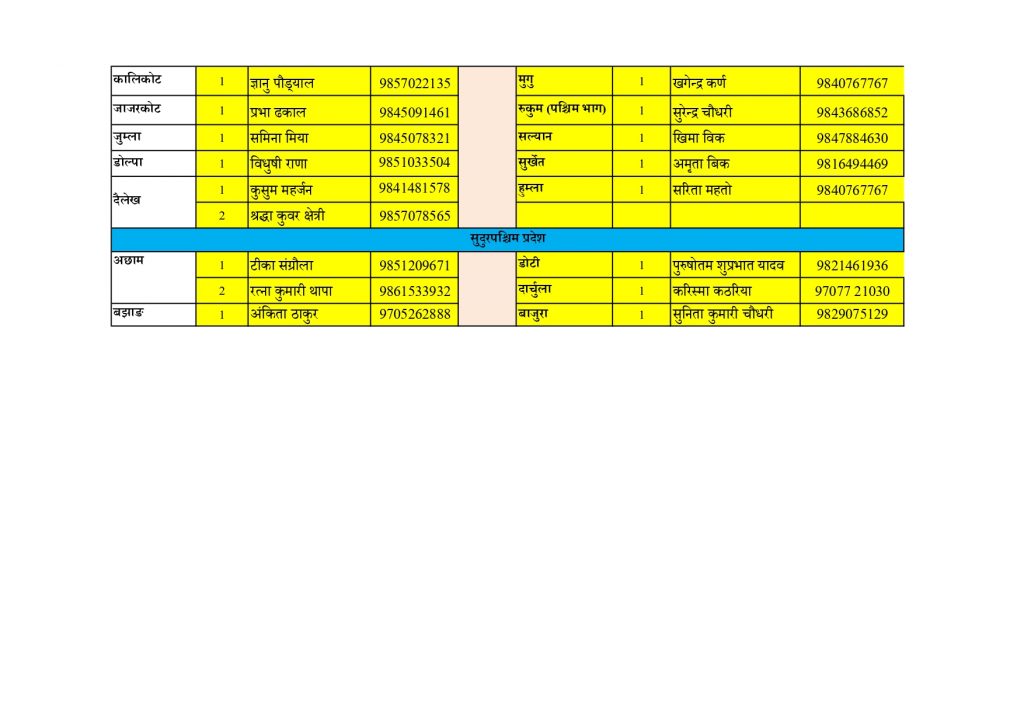 रास्वपाले रीमा विश्वकर्मालाई रुकुम पूर्व, अनुष्का श्रेष्ठलाई रोल्पा, प्रभा ढकाललाई जाजरकोट, विधुषी राणालाई डोल्पा, श्रद्धा कुवँरलाई दैलेख– २, टीका संग्रौलालाई अछाम– १ मा खटाएको छ ।