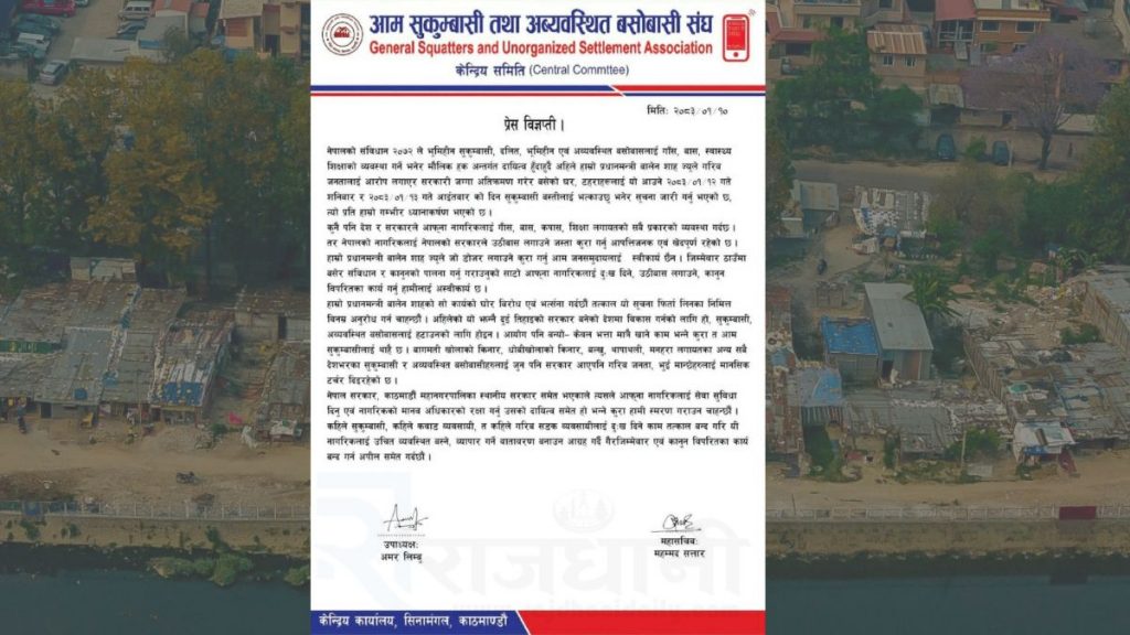 ‘आयोग पनि बन्यो, केवल भत्ता मात्रै खाने काम भन्ने कुरा त आम सुकुम्बासीलाई थाहै छ । बागमती खोला किनार, धोबीखोलाको किनार, बल्खु, थापाथली, मनहरा लगायतका अन्य सै देशभरका सुकुम्बासी र अव्यवस्थित बसोबासीहरुलाई जुन पनि सरकार आए पनि गरिब जनता, भुई मान्छेहरुलाई मानसिक टर्चर दिइरहेको छ,’ संघले जारी गरेको बिज्ञप्तीमा उल्लेख गरिएको छ ।