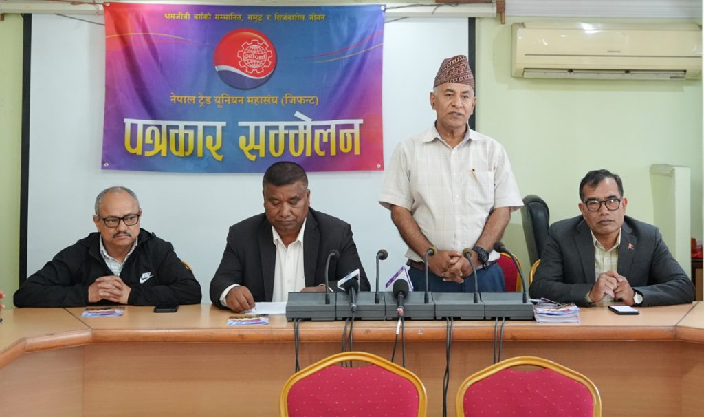काठमाडौं । अन्तर्राष्ट्रिय श्रमिक दिवसका सन्दर्भमा नेपाल ट्रेड युनियन महासंघ (जिफन्ट)ले नौबुँदे घोषणापत्र सार्वजनिक गरेको छ। मंगलबार पत्रकार सम्मेलन गर्दै श्रमिकको हकहितका पक्षमा विभिन्न शीर्षकमा घोषणापत्र सार्वजनिक गरेको हो।