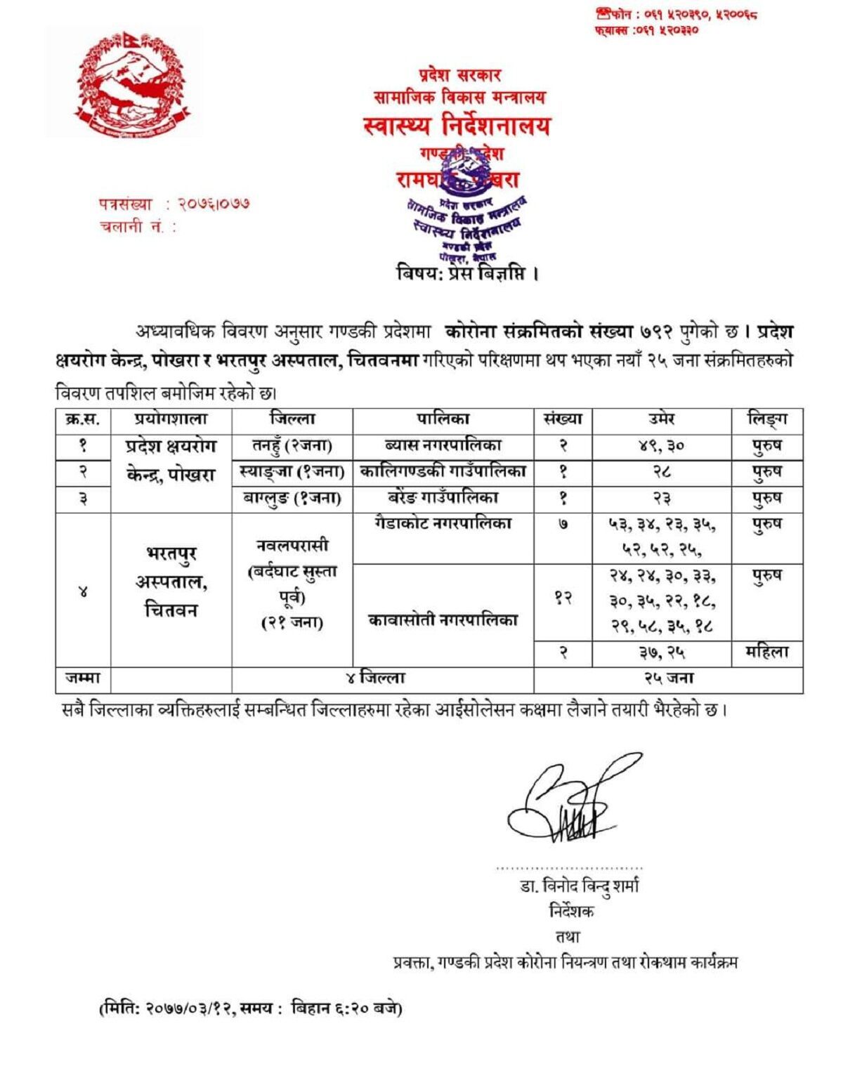 प्रदेश स्वास्थ्य निर्देशनालयका निर्देशक एवं कोरोना नियन्त्रण तथा रोकथाम कार्यक्रम गण्डकी प्रवक्ता डा. विनोदबिन्दु शर्माले शुक्रबार बिहान विज्ञप्ति जारी गरी सो कुराको पुष्टि गरेका हुन् ।