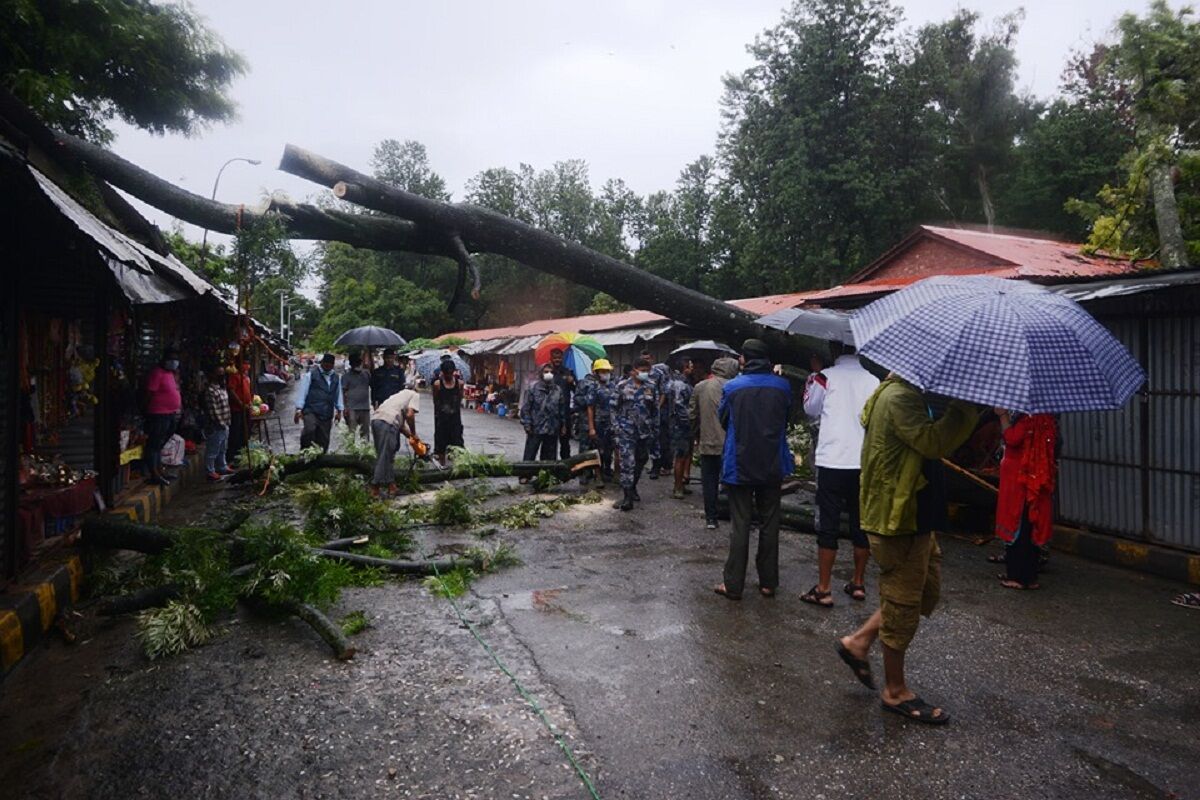 काठमाडौँ । पशुपति क्षेत्र परिसरको फुलपाती बिक्री गर्ने स्थानमा रुख ढलेको छ । पशुपतिमा भक्तजनहरुलाई दर्शन र पुजा गर्न बन्द गरेता पनि आज साउनको पहिलो सोमबार भएका कारण भक्तजनहरु पानीमा रुझ्दै भएपनि दशर्न गर्न आउनेको घुइचो थियो । सोही समयमा एक्सासी ठुलो आवाजसहित ढलेको रुखले केही वेर ’round मानिसहरुको भाग दौड समेत भएको थियो ।