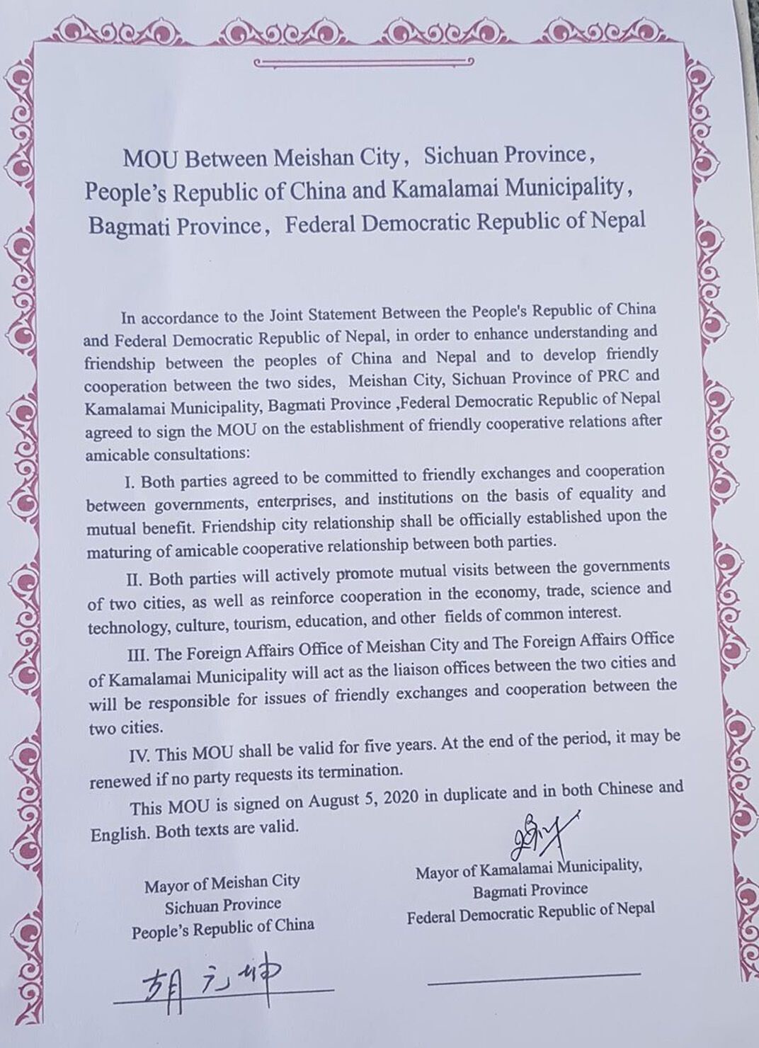काठमाडौं । सिन्धुलीको कमलामाई नगरपालिका र चीनको सिचुवान प्रान्तस्थित मेसान सिटीबीच मैत्रीपूर्ण सहयोग सम्बन्ध स्थापना भएको छ । बुधबार आयोजित भर्चुअल समारोहमा कमलामाईका मेयर खड्ग खत्री र मेसानका मेयर ह्यु आनखुनले समझदारीपत्रमा हस्ताक्षर गर्दै दुई नगरबीच आपसी हितका आधारमा मैत्रीपूर्ण सहयोग आदानप्रदानको प्रतिबद्धता व्यक्त गरे ।