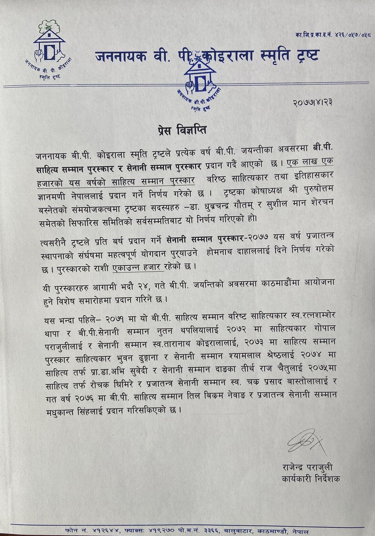 त्यसरी नै ट्रष्टले प्रति बर्ष प्रदान गर्नेे बी.पी. सेनानी सम्मान पुरस्कार–२०७७ यस वर्ष प्रजातन्त्र स्थापनाको संर्घषमा महत्वपूर्ण योगदान पु¥याउने होमनाथ दाहाललाई दिने निर्णय गरेको छ । पुरस्कारको राशी एकाउन्न हजार रहेको छ ।