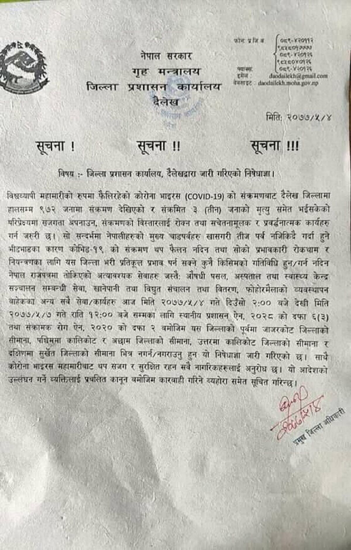 कोरोना संक्रमण फैलिन नदिन दैलेखमा निषेधाज्ञा जारी