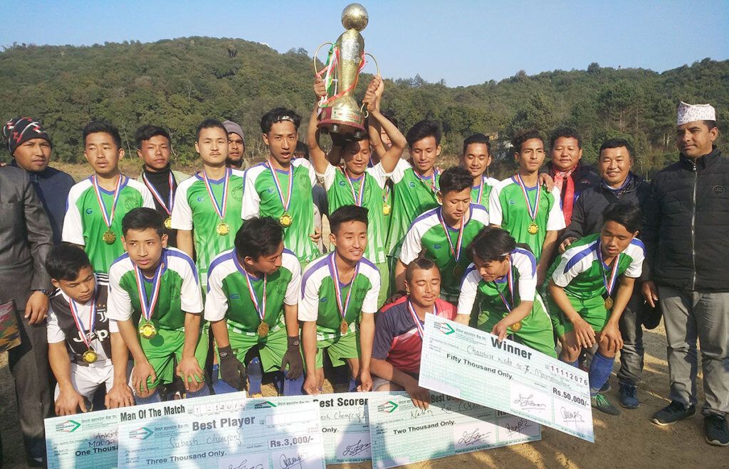 धनकुटा । चौबिसे गाउँपालिका वडा नं.७ मौनाबुधुकले प्रथम चौबिसे रनिङ कप फुटबल प्रतियोगिताको उपाधि जितेको छ । फाइनलमा वडा नं. ६ राजारानीलाई ०–१ गोल अन्तरले पराजित गर्दै मौनाबुधुकले उपाधिमाथि कब्जा जमाएको हो ।