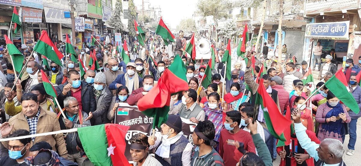 स्थानिय शिवमन्दिरको प्राङ्गणबाट निस्केको बिरोध जुलुस नगर परिक्रमा पश्चात् सहिद दशन चौकमा पुगी सभामा परिणत भएको थियो । प्रदर्शनमा सहभागि नेता कार्यकर्ताहरुले प्रम ओली बिरुद्ध चर्को नाराबाजीका साथै प्रतिनिधिसभा विघटनको असंबैधानिक कदम खारेज गर, सर्वसत्तावादी कदम मुर्दावाद, प्रतिनिधिसभा विघटन जनमतको धोखा हो लगायतका नारा लगाएका थिए ।