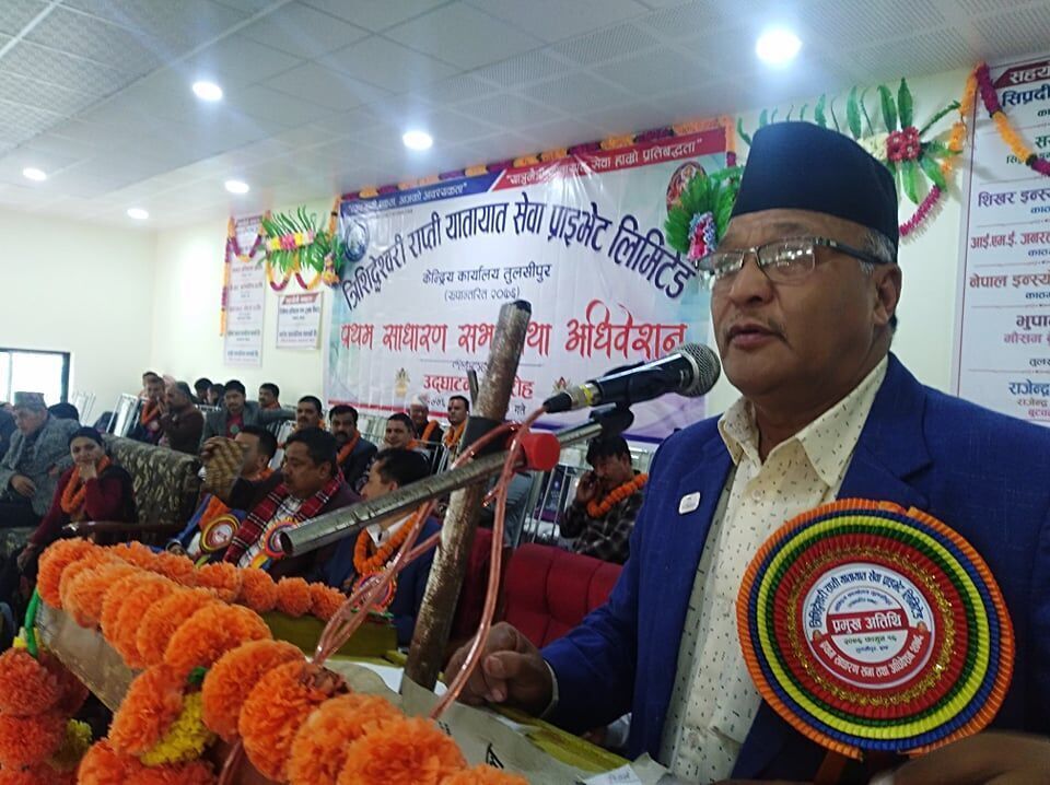 त्रिशिद्धेश्वरी राप्ती यातायात प्राईभेट लिमिटेडको प्रथम साधारणसभा तथा अधिवेसनलाई सम्बोधन गदै नीजि क्षेत्रका यातायात व्यवसायीले एकलौटी लुटेको मात्रै छ भन्ने आँखाबाट नहेर्न सरकारलाई उनिहरुले आग्रह गरे । डोजर इन्जियिनर भएर निर्माण गरेको पहाडी सडकमा घरसम्पती बन्दकी राखेर किनेका सवारीलाई चलाएर मानविय सेवा गरेको बताउँदै उनिहरुले सरकारले आफुहरुलाई सहयोगीका रुपमा हेर्नुपर्नेमा जोड दिए ।