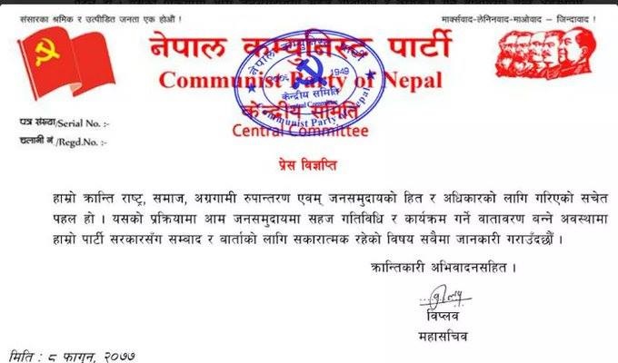 विप्लवको विज्ञप्तिमा भनिएको छ–आम जनसमुदायमा सहज गतिविधि र कार्यक्रम गर्ने वातावरण बन्ने अवस्थामा हाम्रो पार्टी सरकारसँग संवाद र वार्ताको लागि सकारात्मक रहेको विषय सबैमा जानकारी गराउँछौं।