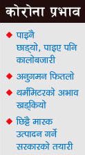 केमिकल एन्ड मेडिकल सप्लायर्स एसोसिएनका सचिव अर्जुन रायमाझीले कच्चा पदार्थ नआउँदा सर्जिकल मास्क उत्पादन गर्ने उद्योगहरू बन्द रहेको बताए । उनले भने, ‘माग बढी छ । तर, कच्चापदार्थ नआएको दुई महिना बितिसक्यो । सरकार पनि यस विषयमा गम्भीर हुनुपर्छ ।’