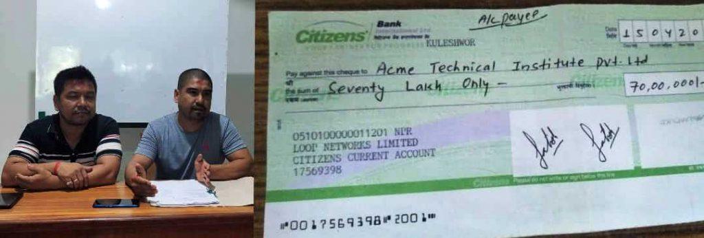 लुप नेटवर्क लिमिटेडले सिटिजन्स बैंक इन्टरनेशनलको साउन १५ कै मितिको ७० लाखको चेक एक्मीका पुर्व सञ्चालक प्रियब्रत श्रेष्ठलाई दियो । तर, खातामा रकम नभएपछि उक्त चेक साउन २९, ३१ र भदौ २ गते तीनपटक सम्म साटिएन ।