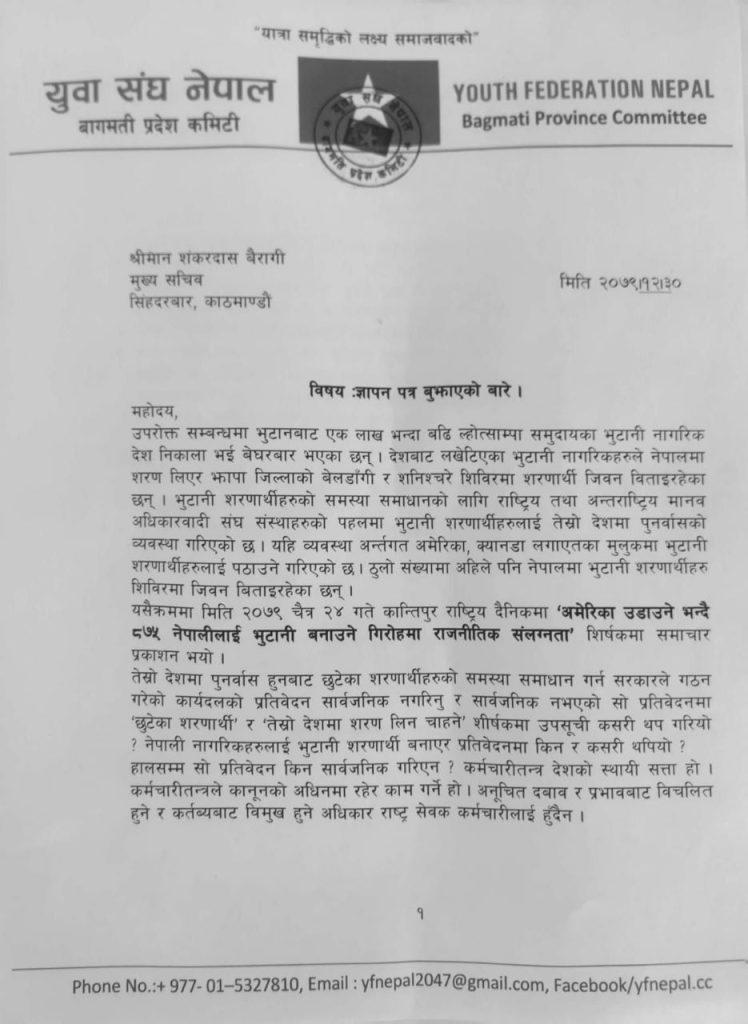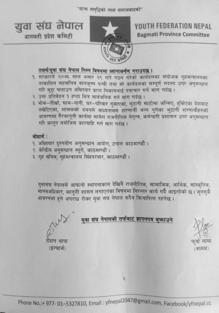 ‘भोक—तीर्खा, घाम—पानी, घर—परिवार गुमाएका, भुटानी माटोमा जन्मिए, हुर्किएका देशबाट लखेटिएका, शासकको दमनले बाध्यताबस शरणार्थी बन्न पुगेका भुटानी शरणार्थीहरुको आवरणमा गैरकानूनी कार्यमा सामेल राजनीतिक नेतृत्व, कर्मचारी प्रशासन उपर अनुसन्धान गरि कानून बमोजिम कारवाहि गर्न माग गर्दछ’ संघले भनेको छ ।