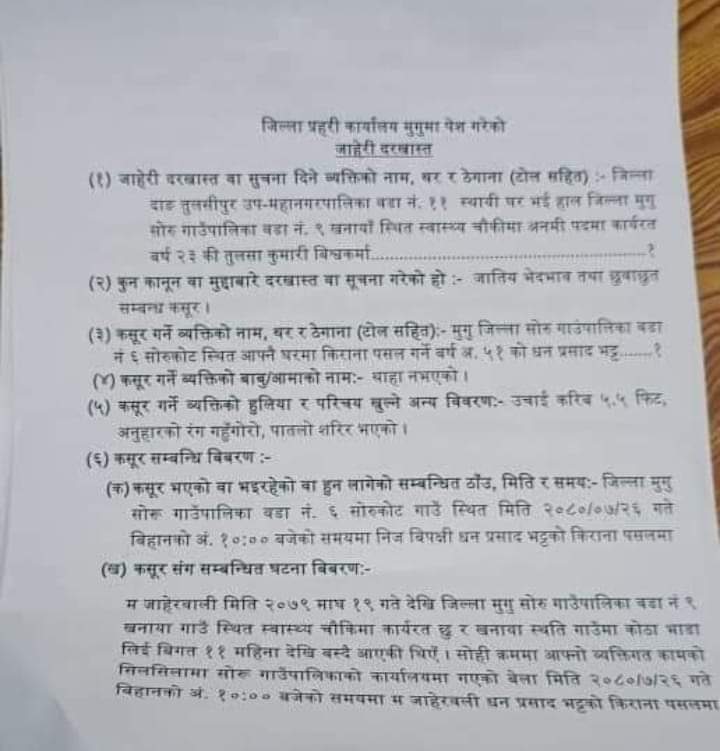 मुगु । मुगुको सोरु गाउँपालिका–९, खनैयाँ स्वास्थ्य चौकीमा कार्यरत स्वास्थ्यकर्मी (अनमी) तुलसाकुमारी विकलाई जातीय भेदभाव गरेको आरोपमा प्रहरीले दुई जनालाई पक्राउ गरेको छ। पक्राउ परेका दुबै जनाविरुद्ध आजै जाहेरी दर्ता भएको जिल्ला प्रहरी कार्यालय मुगुले जनाएको छ।