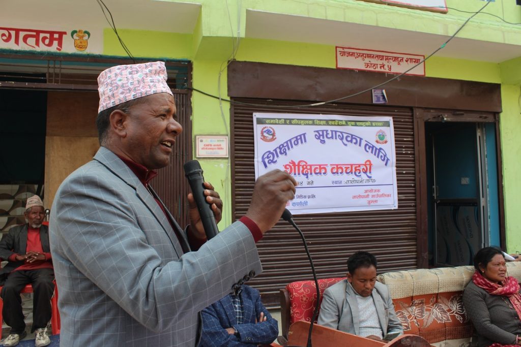 ‘सामुदायिक विद्यालयमा राज्यको करोडौँ लगानी छ, तर विद्यालयमा विद्यार्थी संख्या घटिरहेको छ । कतिपय कक्षा रित्तो बन्ने अवस्थामा पुगेका छन् । बाँकी विद्यार्थीलाई गाउँमै रोक्ने वातावरण बन्न सकेन भने केही वर्षपछि विद्यालय नै रित्तो बन्ने अवस्था आउने सङ्केत देखिन थालेका छन्, अध्यक्ष चौंलागाईले भने, ‘आवश्यकताका आधारमा विद्यालय मर्ज गर्ने, शिक्षक व्यवश्थापन गर्ने, शैक्षिक गुणस्तरलाई लयमा ल्याउने उदेश्यले अन्तक्र्रियात्मक कार्यक्रम शैक्षिक कचहरी सुरु गरिएको हो ।’