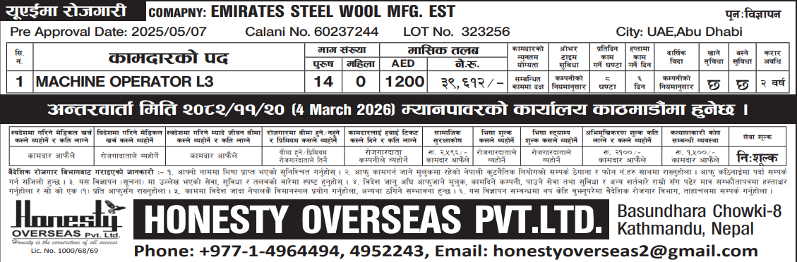 Male : MACHINE OPERATOR L3 in UAE, 14 no