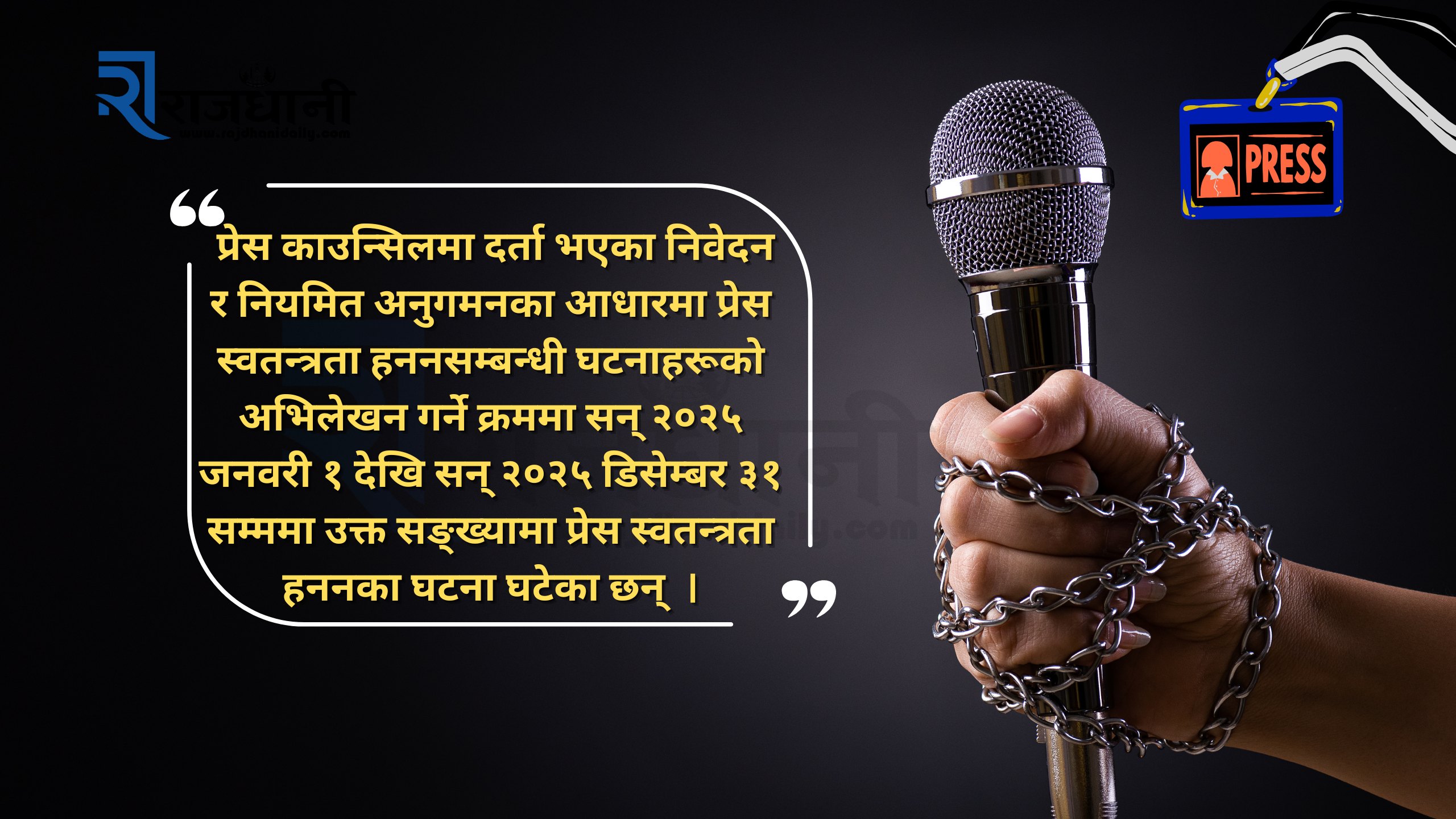 काठमाडौं । नेपालमा एक वर्षमा प्रेस स्वतन्त्रतता हननका १२१ घटना घटेको पाइएको छ । प्रेस