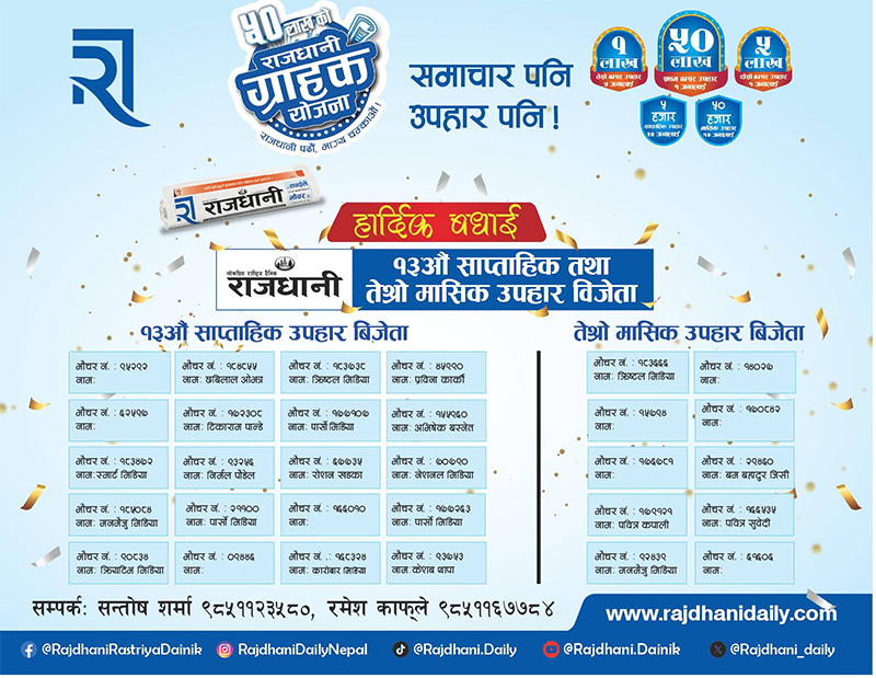 १३औं साप्ताहिक तथा तेश्रो मासिक राजधानी उपहार विजेता